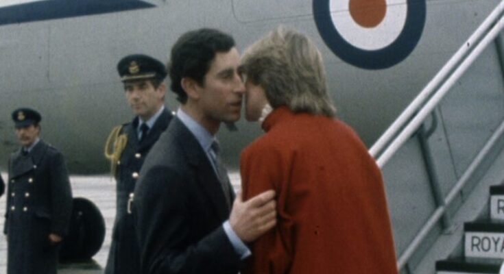 Dressed in a red coat, fawn skirt, and brown leather shoes, Diana walked beside the Prince through puddles at the airport after arriving in the Queen’s Rolls-Royce.